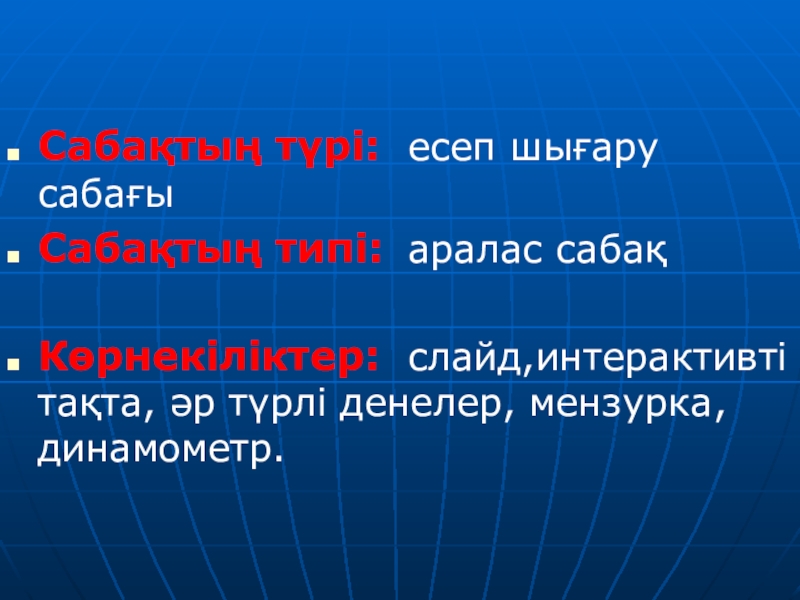 Сабақтың түрі:	есеп шығару сабағыСабақтың типі:	аралас сабақКөрнекіліктер:	слайд,интерактивті тақта, әр түрлі денелер, мензурка, динамометр.