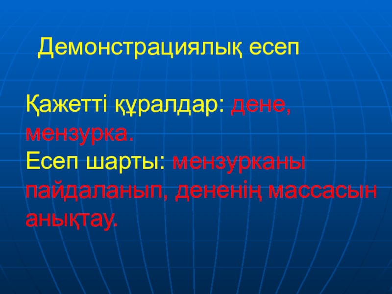 Демонстрациялық есеп  Қажетті құралдар: дене, мензурка.  Есеп шарты: мензурканы пайдаланып, дененің массасын анықтау.