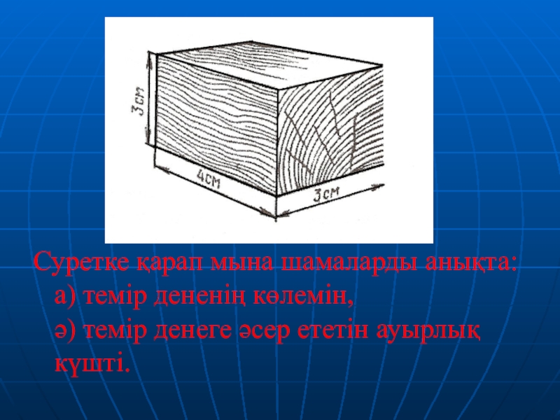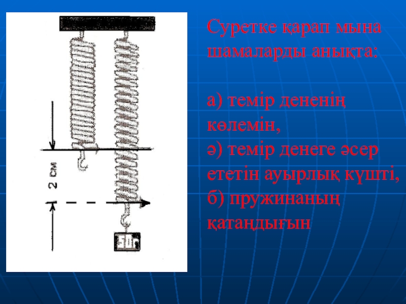 Слайд 7Суретке қарап мына шамаларды анықта: а) темір дененің көлемін, ә) темір денеге әсер