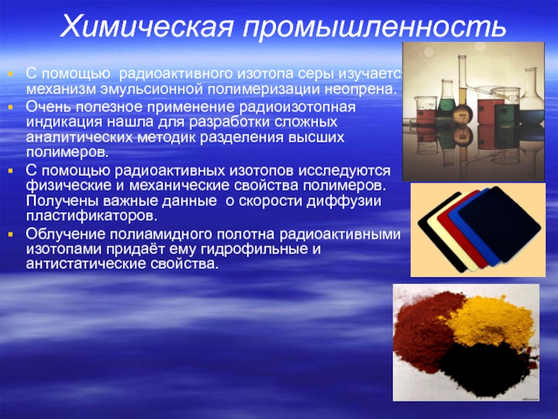 Химическая промышленность С помощью радиоактивного изотопа серы изучается механизм эмульсионной полимеризации неопрена.Очень полезное применение радиоизотопная индикация нашла