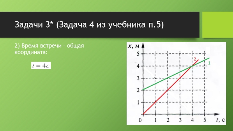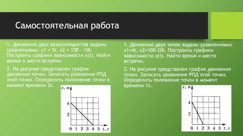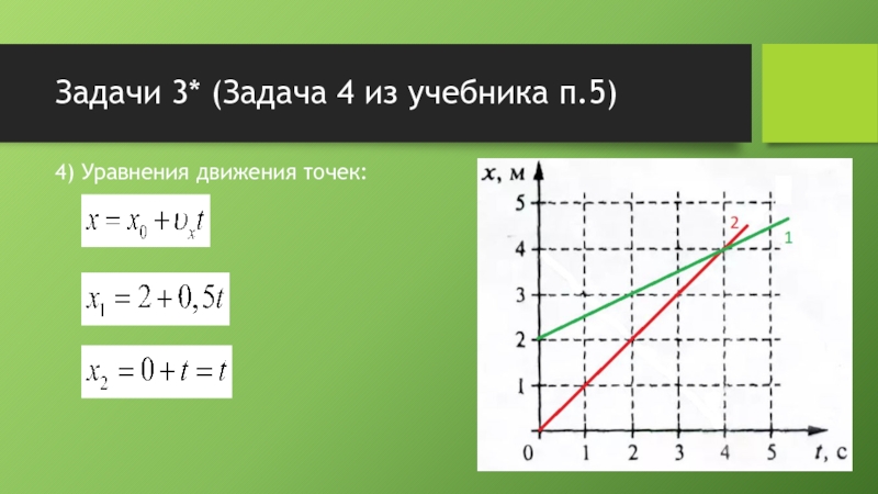 1. Движения двух точек заданы уравнениями: х1=4t, x2=100-20t. Построить графики зависимости х(t). Найти время и место встречи.