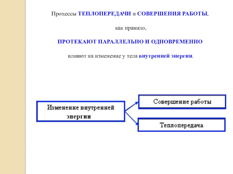 Процессы ТЕПЛОПЕРЕДАЧИ и СОВЕРШЕНИЯ РАБОТЫ, как правило, ПРОТЕКАЮТ ПАРАЛЛЕЛЬНО И ОДНОВРЕМЕННО влияют на изменение у тела внутренней