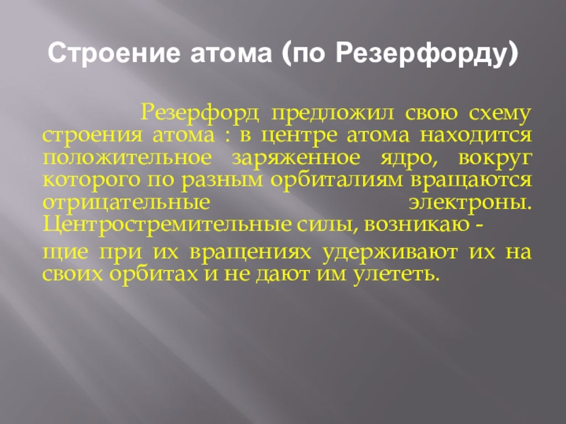 схему строения атома : в центре атома находится положительное заряженное ядро, вокруг которого по разным орбиталиям вращаются отрицательные электроны. Центростремительные силы, возникаю -