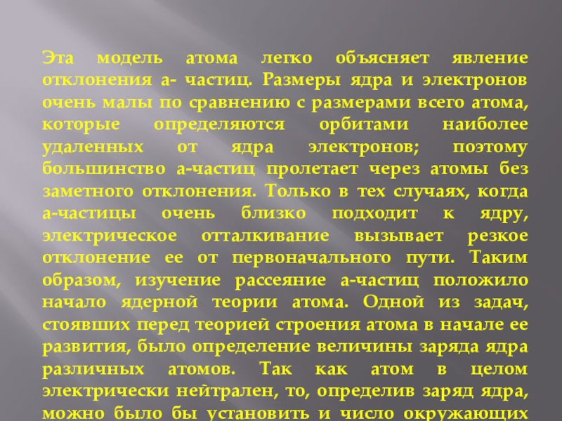 Слайд 16Эта модель атома легко объясняет явление отклонения a- частиц. Размеры ядра