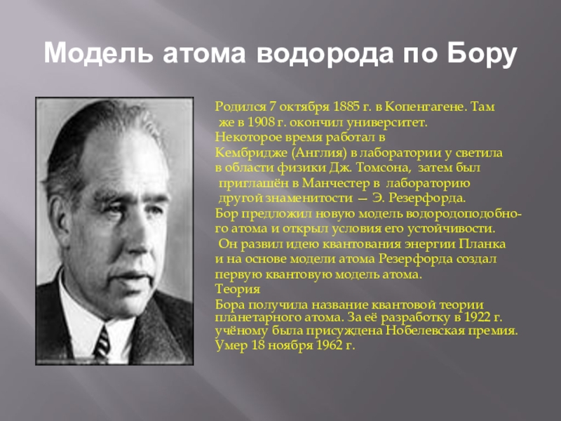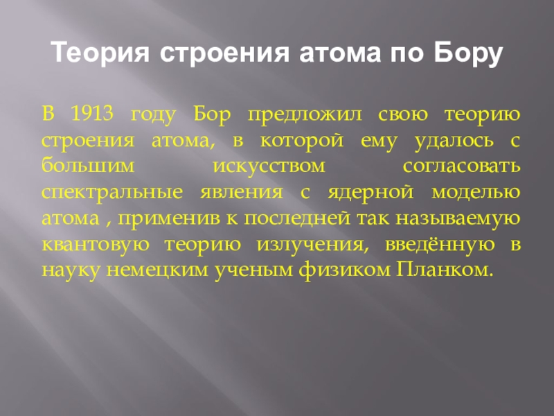 строения атома, в которой ему удалось с большим искусством согласовать спектральные явления с ядерной моделью атома , применив к последней так называемую квантовую теорию излучения, введённую в науку немецким ученым физиком Планком.
