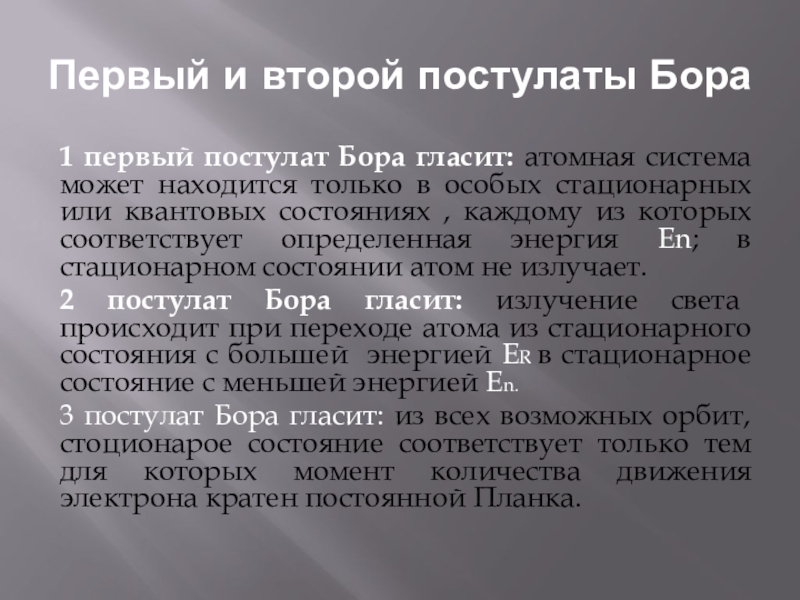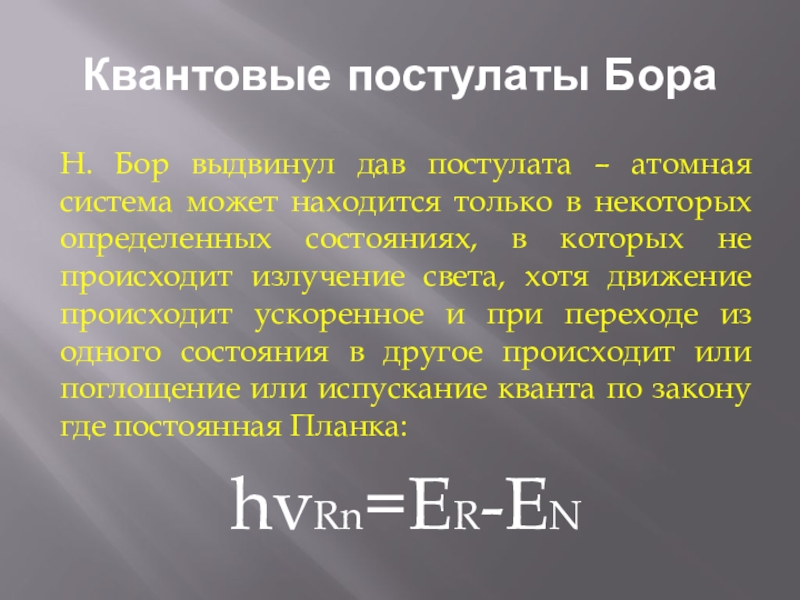 находится только в некоторых определенных состояниях, в которых не происходит излучение света, хотя движение происходит ускоренное и при переходе из одного состояния в другое происходит или поглощение или испускание кванта по закону где постоянная Планка: