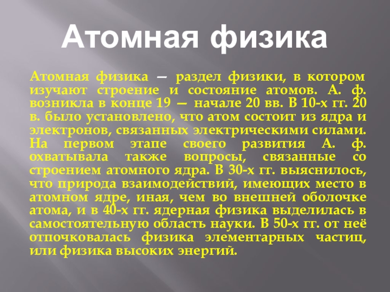состояние атомов. А. ф. возникла в конце 19 — начале 20 вв. В 10-х гг. 20 в. было установлено, что атом состоит из ядра и электронов, связанных электрическими силами. На первом этапе своего развития А. ф. охватывала также вопросы, связанные со строением атомного ядра. В 30-х гг. выяснилось, что природа взаимодействий, имеющих место в атомном ядре, иная, чем во внешней оболочке атома, и в 40-х гг. ядерная физика выделилась в самостоятельную область науки. В 50-х гг. от неё отпочковалась физика элементарных частиц, или физика высоких энергий.