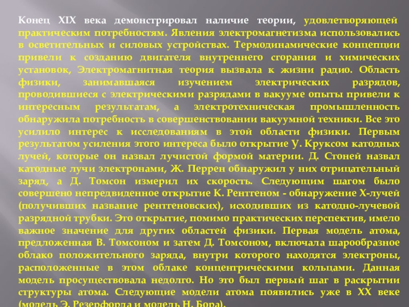 использовались в осветительных и силовых устройствах. Термодинамические концепции привели к созданию двигателя внутреннего сгорания и химических установок, Электромагнитная теория вызвала к жизни радио. Область физики, занимавшаяся изучением электрических разрядов, проводившиеся с электрическими разрядами в вакууме опыты привели к интересным результатам, а электротехническая промышленность обнаружила потребность в совершенствовании вакуумной техники. Все это усилило интерес к исследованиям в этой области физики. Первым результатом усиления этого интереса было открытие У. Круксом катодных лучей, которые он назвал лучистой формой материи. Д. Стоней назвал катодные лучи электронами, Ж. Перрен обнаружил у них отрицательный заряд, а Д. Томсон измерил их скорость. Следующим шагом было совершено непредвиденное открытие К. Рентгеном - обнаружение Х-лучей (получивших название рентгеновских), исходивших из катодно-лучевой разрядной трубки. Это открытие, помимо практических перспектив, имело важное значение для других областей физики. Первая модель атома, предложенная В. Томсоном и затем Д. Томсоном, включала шарообразное облако положительного заряда, внутри которого находятся электроны, расположенные в этом облаке концентрическими кольцами. Данная модель просуществовала недолго. Но это был первый шаг в раскрытии структуры атома. Следующие модели атома появились уже в ХХ веке (модель Э. Резерфорда и модель Н. Бора).