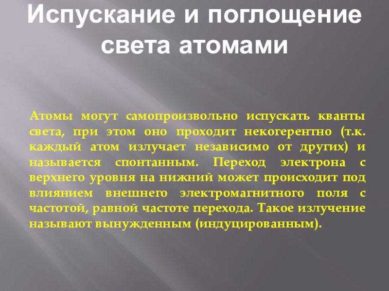 этом оно проходит некогерентно (т.к. каждый атом излучает независимо от других) и называется спонтанным. Переход электрона с верхнего уровня на нижний может происходит под влиянием внешнего электромагнитного поля с частотой, равной частоте перехода. Такое излучение называют вынужденным (индуцированным).