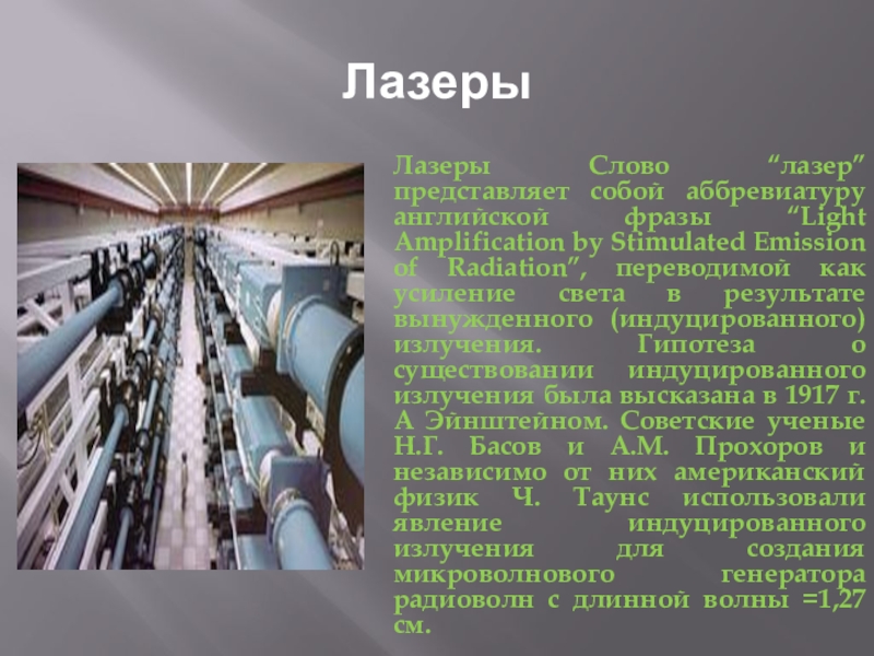 Stimulated Emission of Radiation”, переводимой как усиление света в результате вынужденного (индуцированного) излучения. Гипотеза о существовании индуцированного излучения была высказана в 1917 г. А Эйнштейном. Советские ученые Н.Г. Басов и А.М. Прохоров и независимо от них американский физик Ч. Таунс использовали явление индуцированного излучения для создания микроволнового генератора радиоволн с длинной волны =1,27 см.