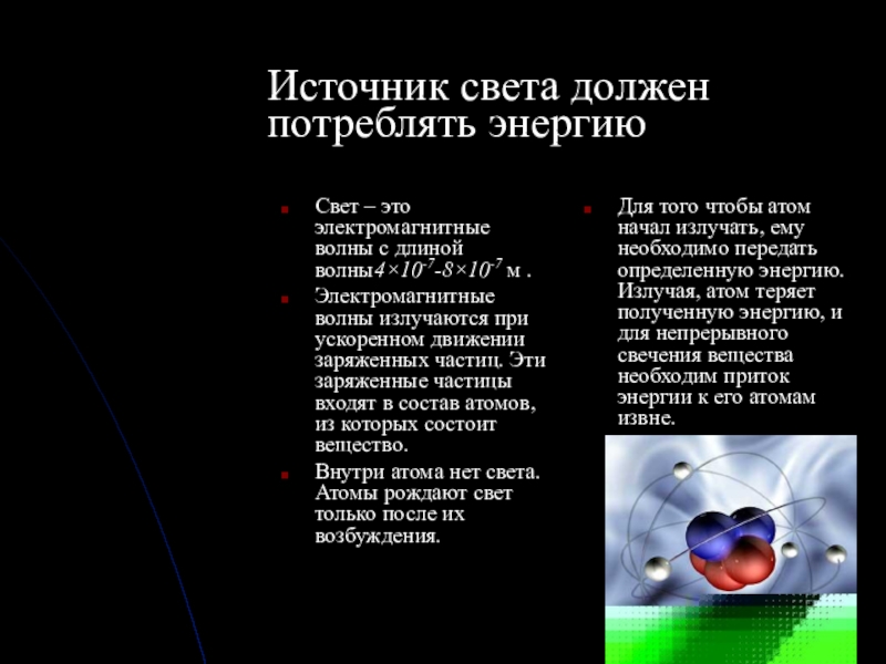 Для того чтобы атом начал излучать, ему необходимо передать определенную энергию. Излучая, атом теряет полученную энергию, и для непрерывного свечения вещества необходим приток энергии к его атомам извне.
