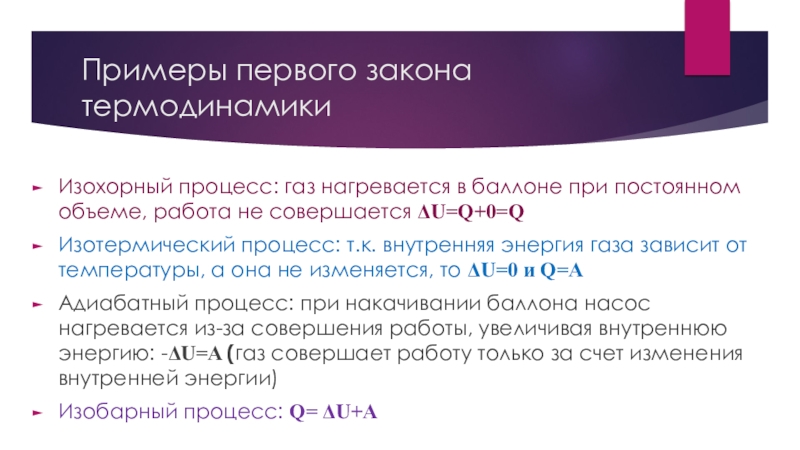 Изотермический процесс: т.к. внутренняя энергия газа зависит от температуры, а она не изменяется, то ΔU=0 и Q=А