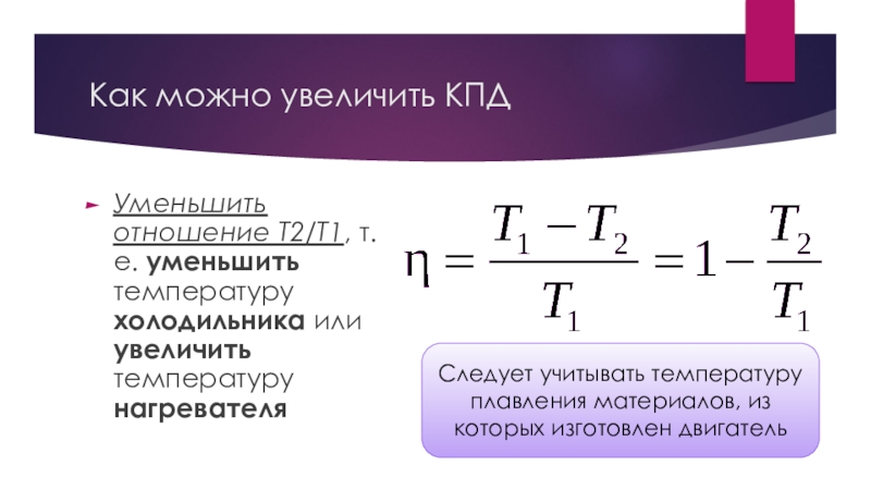 Уменьшить отношение Т2/Т1, т.е. уменьшить температуру холодильника или