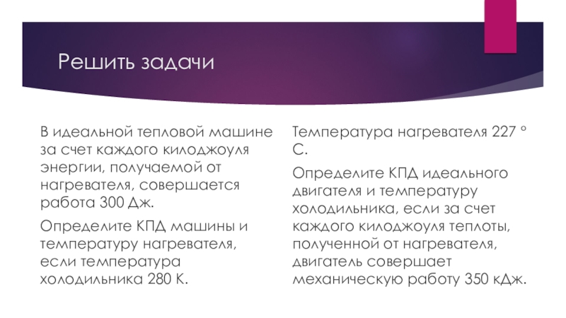 Определите КПД идеального двигателя и температуру холодильника, если за счет каждого килоджоуля теплоты, полученной от нагревателя, двигатель совершает механическую работу 350 кДж.