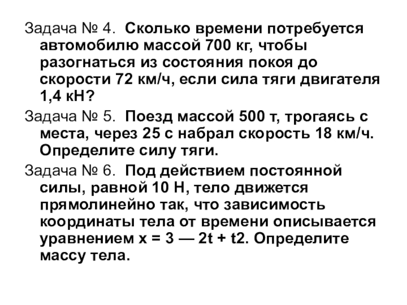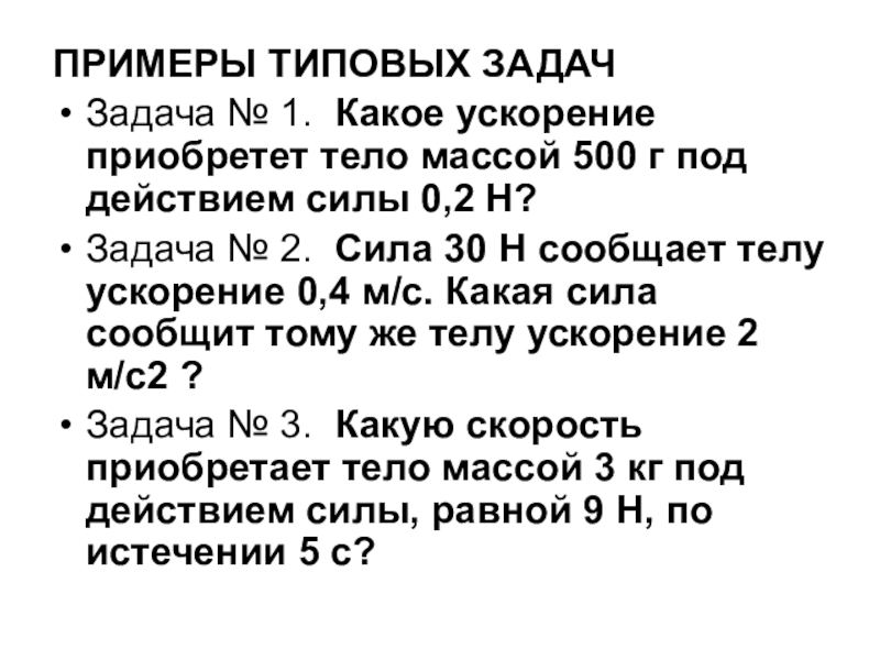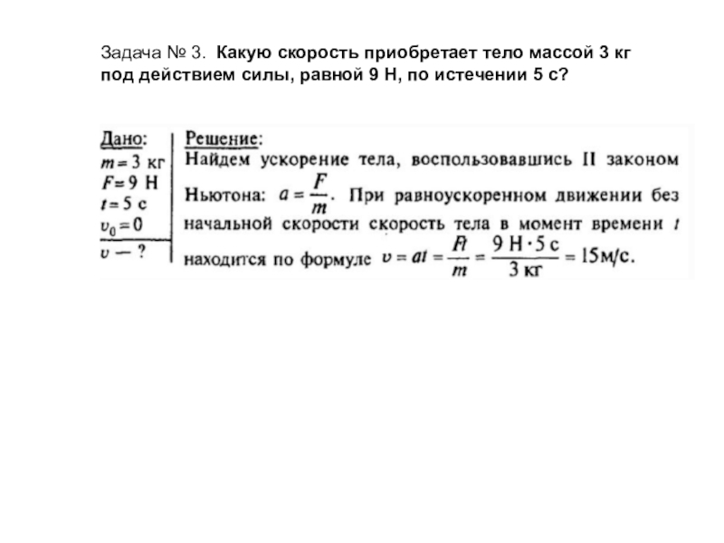 Задача № 3. Какую скорость приобретает тело массой 3 кг под действием силы, равной 9 Н, по истечении 5 с?