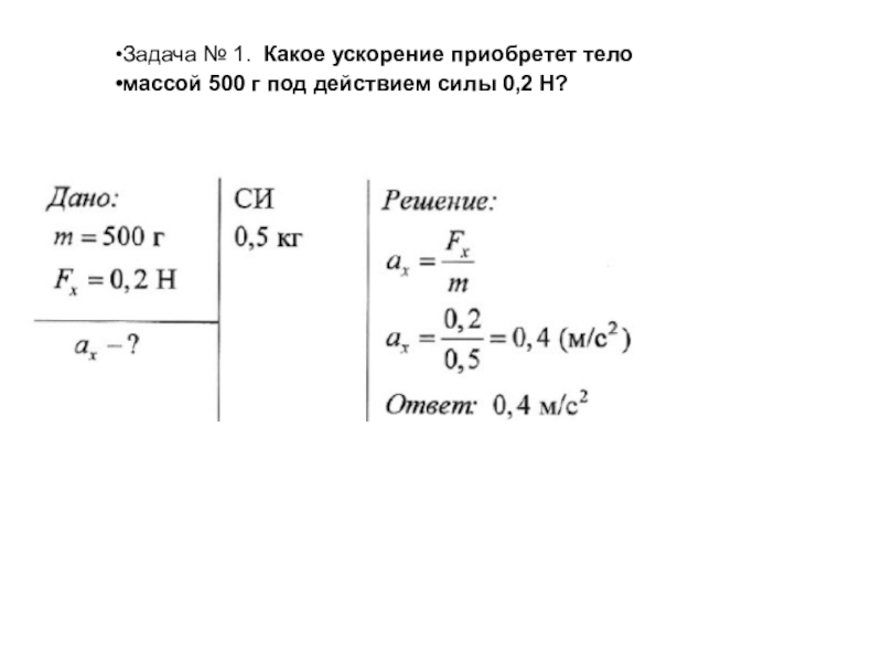 Задача № 2. Сила 30 Н сообщает телу ускорение 0,4 м/с. Какая сила сообщит тому же телу ускорение 2 м/с2 ?