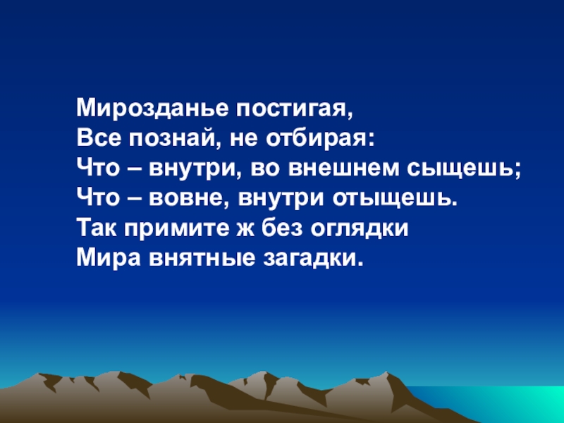 Мирозданье постигая,Все познай, не отбирая:Что – внутри, во внешнем сыщешь;Что – вовне, внутри отыщешь.Так примите ж без оглядкиМира внятные загадки.