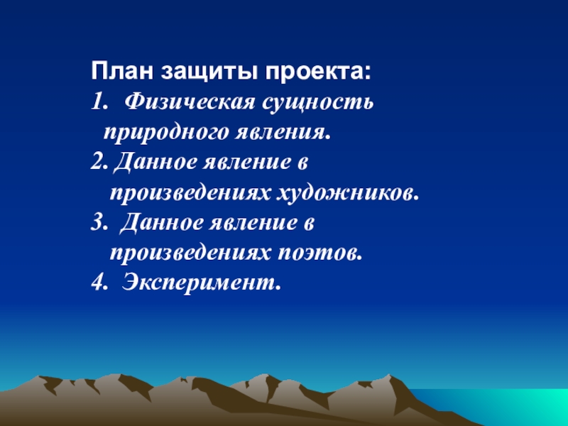 План защиты проекта:1. Физическая сущность  природного явления.2. Данное явление в  произведениях художников.3. Данное явление в