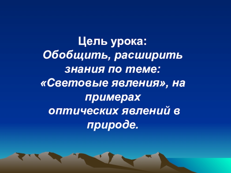 Цель урока: Обобщить, расширить знания по теме: «Световые явления», на примерах оптических явлений в природе.
