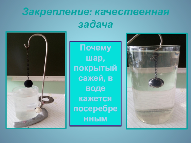 Закрепление: качественная задачаПочему шар, покрытый сажей, в воде кажется посеребренным