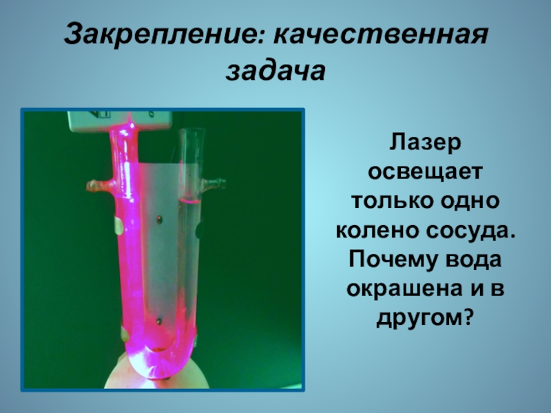 Закрепление: качественная задачаЛазер освещает только одно колено сосуда. Почему вода окрашена и в другом?