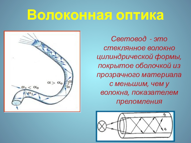 Волоконная оптикаСветовод - это стеклянное волокно цилиндрической формы, покрытое оболочкой из прозрачного материала с меньшим, чем у