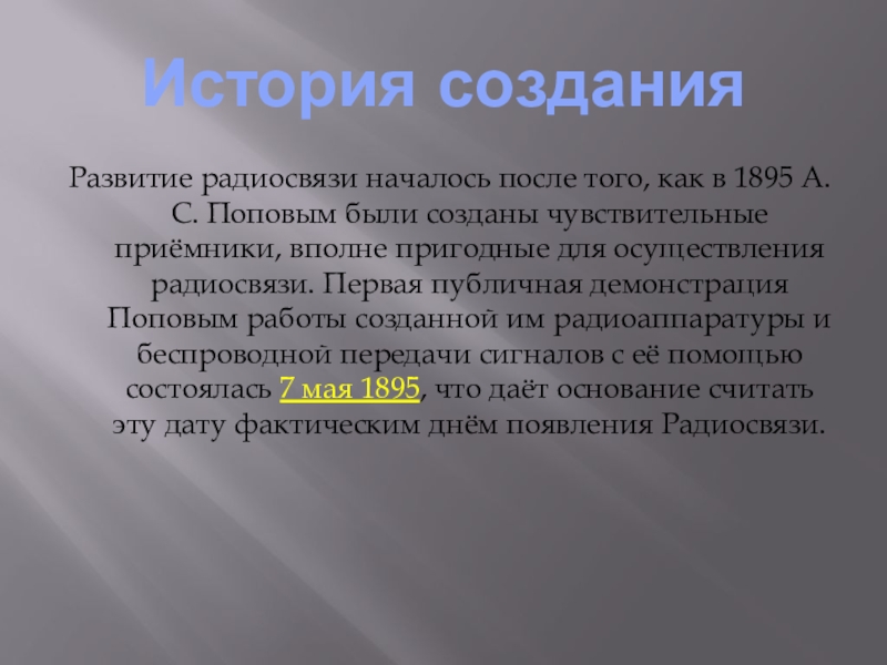 История созданияРазвитие радиосвязи началось после того, как в 1895 А. С. Поповым были созданы чувствительные приёмники, вполне