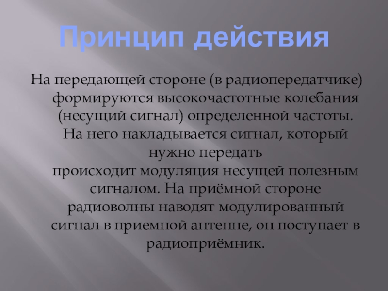 Принцип действия На передающей стороне (в радиопередатчике) формируются высокочастотные колебания (несущий сигнал) определенной частоты. На него накладывается сигнал,