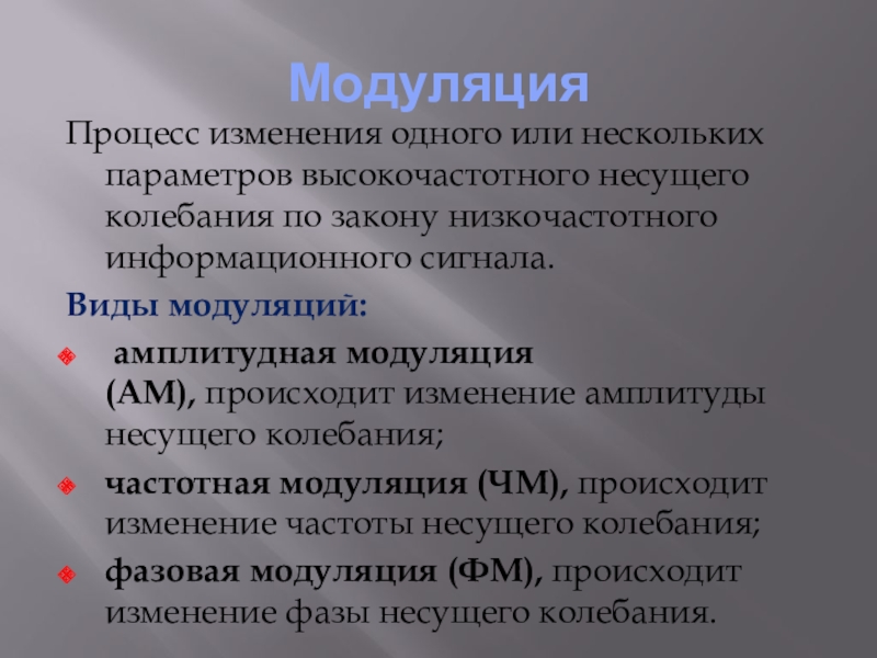 МодуляцияПроцесс изменения одного или нескольких параметров высокочастотного несущего колебания по закону низкочастотного информационного сигнала.Виды модуляций: амплитудная модуляция