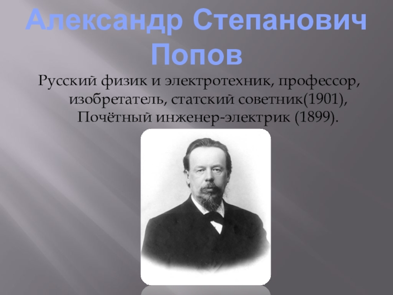 Александр Степанович ПоповРусский физик и электротехник, профессор, изобретатель, статский советник(1901), Почётный инженер-электрик (1899).