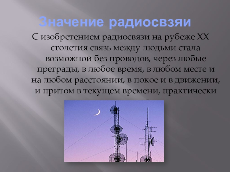 Значение радиосвзяиС изобретением радиосвязи на рубеже XX столетия связь между людьми стала возможной без проводов, через любые