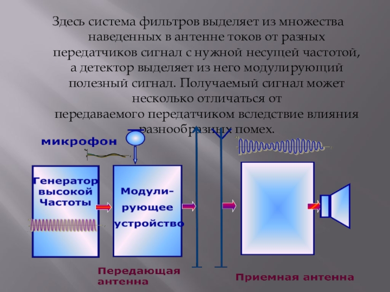 Слайд 6Здесь система фильтров выделяет из множества наведенных в антенне токов от