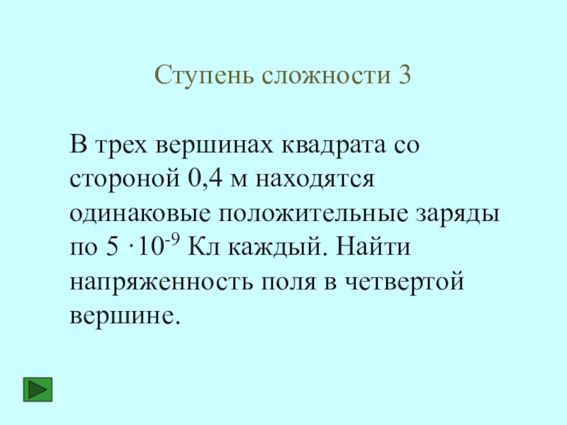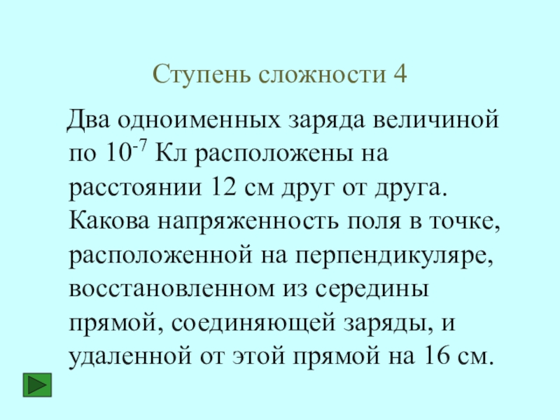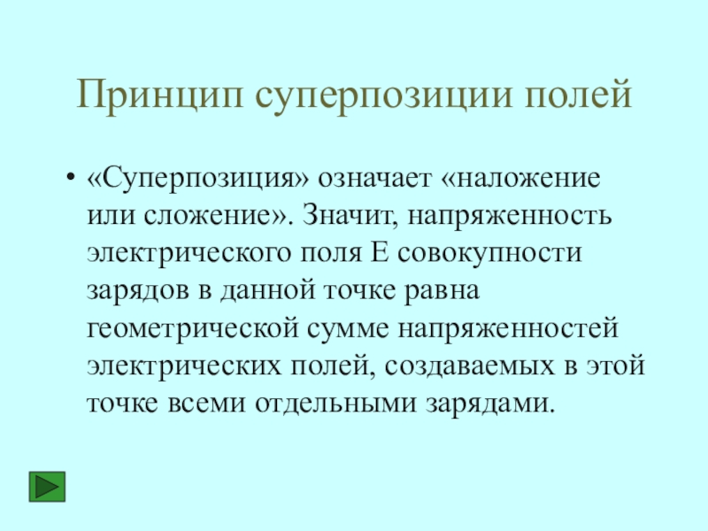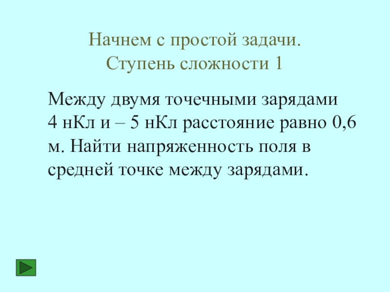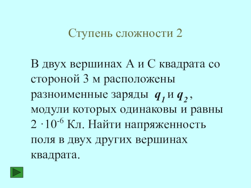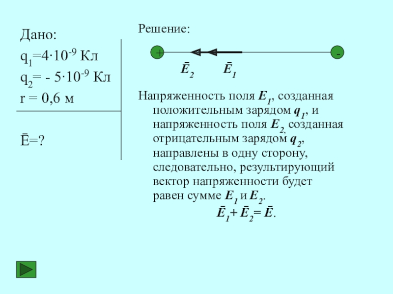 Напряженность поля Е1, созданная положительным зарядом q1, и напряженность поля Е2, созданная отрицательным зарядом q2, направлены в одну сторону, следовательно, результирующий вектор напряженности будет равен сумме Е1 и Е2.