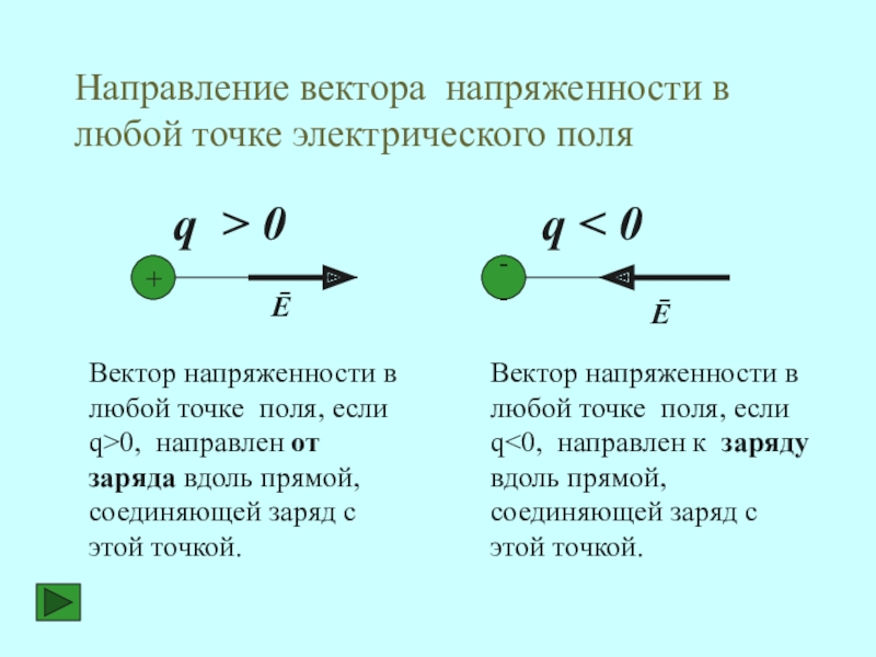 Вектор напряженности в любой точке поля, если q<0, направлен к заряду вдоль прямой, соединяющей заряд с этой точкой.