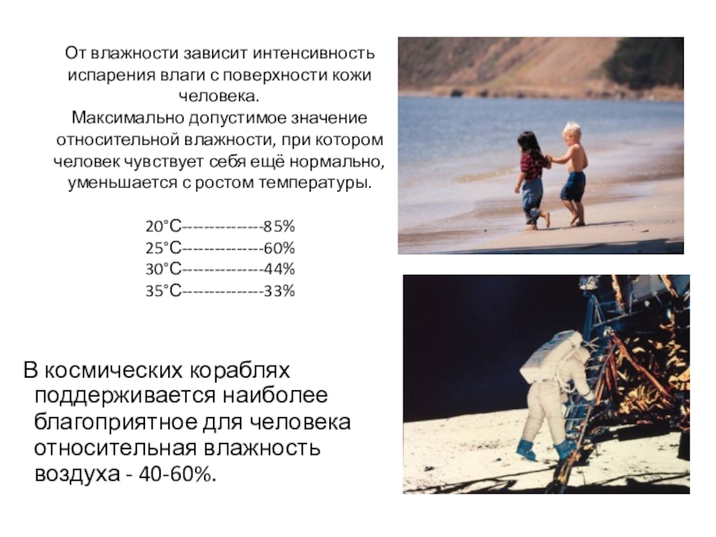 В космических кораблях поддерживается наиболее благоприятное для человека относительная влажность воздуха - 40-60%.