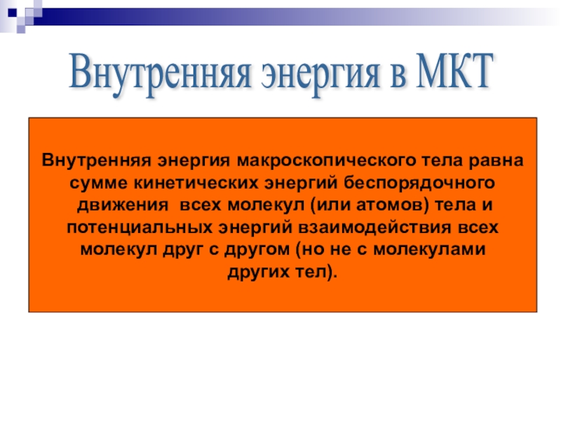 Внутренняя энергия в МКТ Внутренняя энергия макроскопического тела равнасумме кинетических энергий беспорядочного движения всех молекул (или атомов)