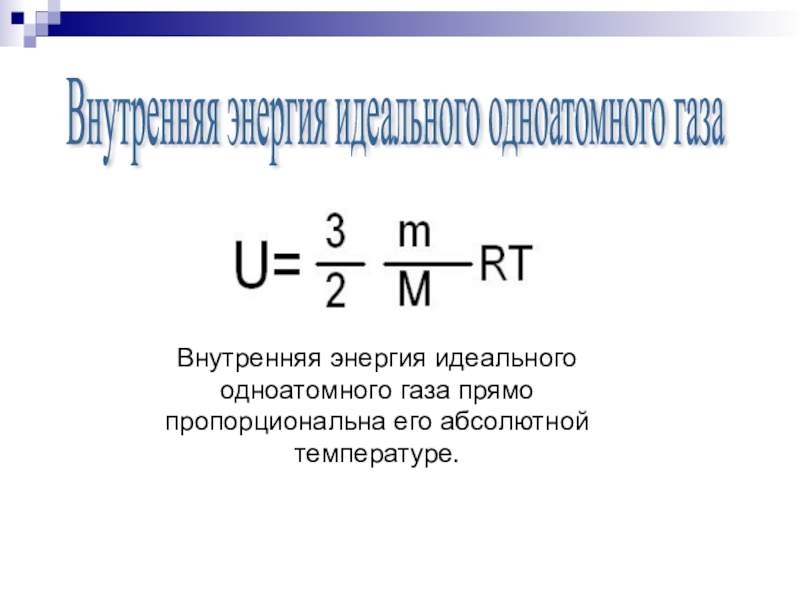 Внутренняя энергия идеального одноатомного газа Внутренняя энергия идеального одноатомного газа прямо пропорциональна его абсолютной температуре.