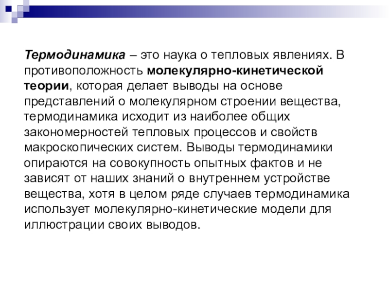 Слайд 2Термодинамика – это наука о тепловых явлениях. В противоположность молекулярно-кинетической теории,