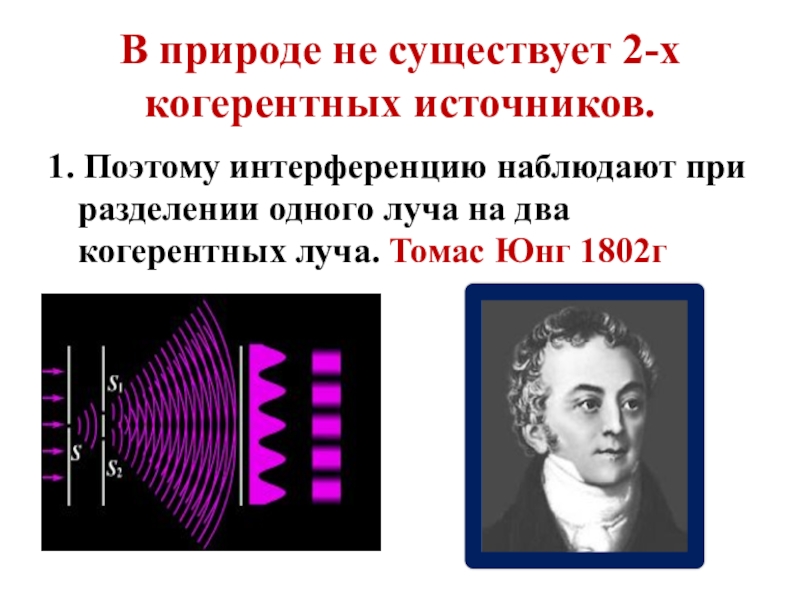 В природе не существует 2-х когерентных источников.1. Поэтому интерференцию наблюдают при разделении одного луча на два когерентных