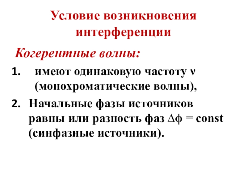 Условие возникновения интерференцииКогерентные волны: имеют одинаковую частоту ν (монохроматические волны),Начальные фазы источников равны или разность фаз ∆ϕ