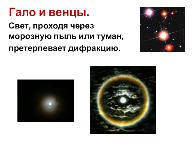 Гало и венцы.Свет, проходя через морозную пыль или туман,претерпевает дифракцию.