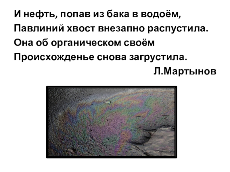 И нефть, попав из бака в водоём,Павлиний хвост внезапно распустила.Она об органическом своёмПроисхожденье снова загрустила.Л.Мартынов