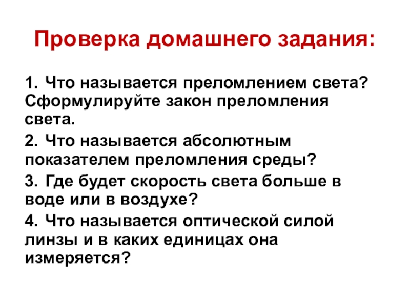 Проверка домашнего задания:1. Что называется преломлением света? Сформулируйте закон преломления света.2. Что называется абсолютным показателем преломления среды?3. Где будет скорость света больше в воде или в воздухе?4. Что называется оптической силой линзы и в каких единицах она измеряется?