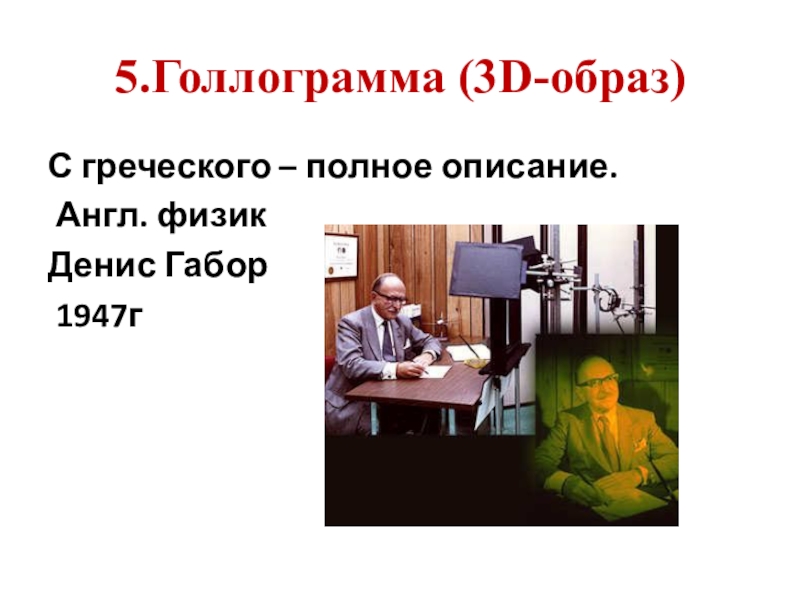5.Голлограмма (3D-образ)С греческого – полное описание. Англ. физик Денис Габор 1947г