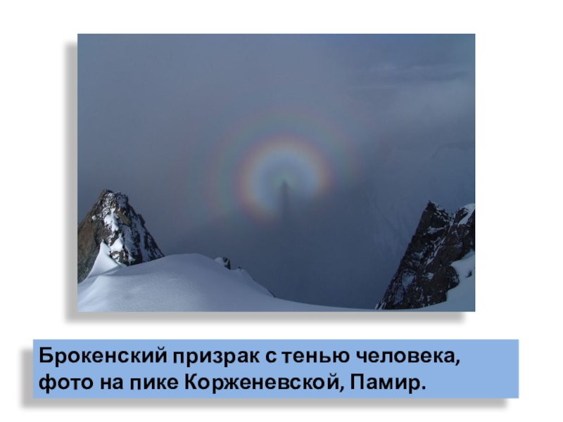 Слайд 61Брокенский призрак с тенью человека, фото на пике Корженевской, Памир.