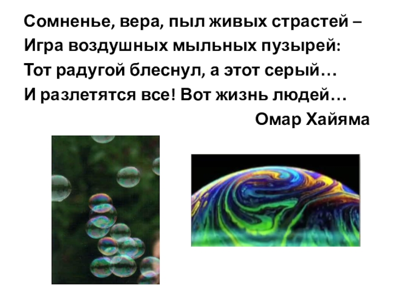 Сомненье, вера, пыл живых страстей –Игра воздушных мыльных пузырей:Тот радугой блеснул, а этот серый…И разлетятся все! Вот