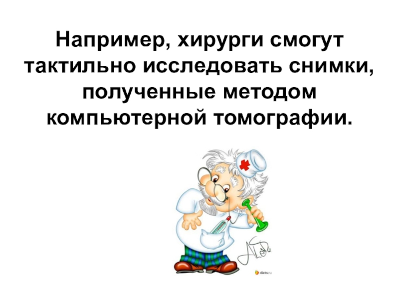 Слайд 5Например, хирурги смогут тактильно исследовать снимки, полученные методом компьютерной томографии.