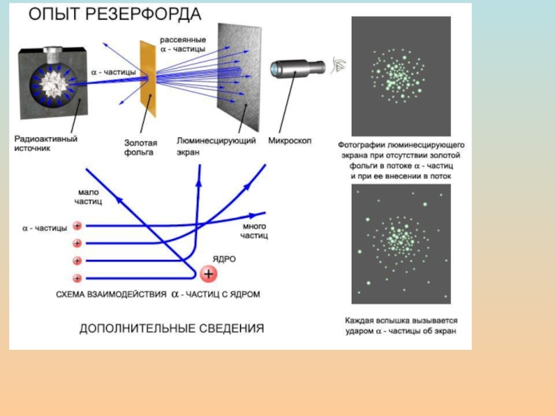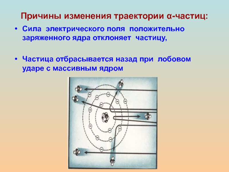 Причины изменения траектории α-частиц:Сила электрического поля положительно заряженного ядра отклоняет частицу,Частица отбрасывается назад при лобовом ударе с