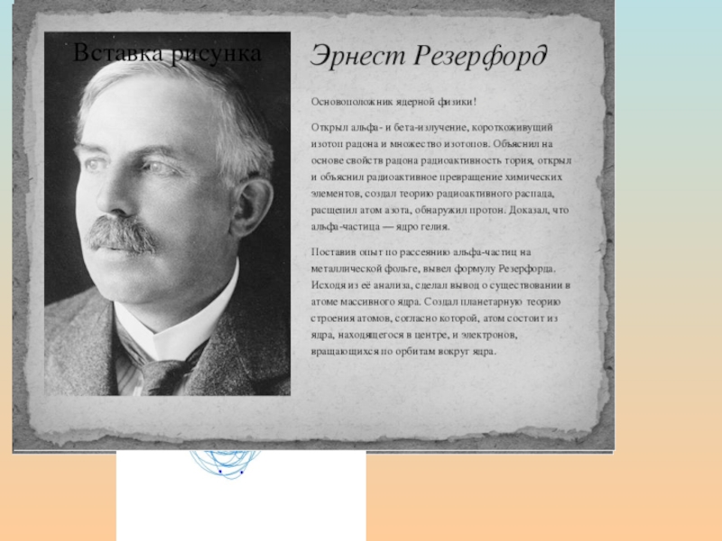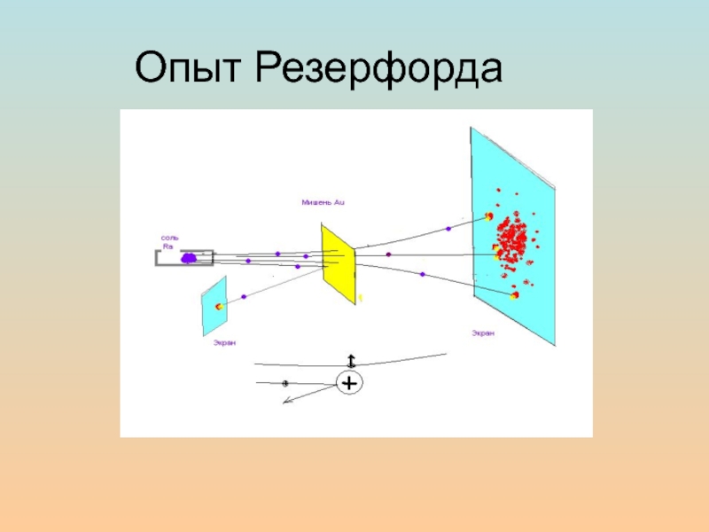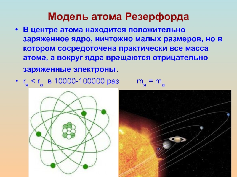 Модель атома РезерфордаВ центре атома находится положительно заряженное ядро, ничтожно малых размеров, но в котором сосредоточена практически
