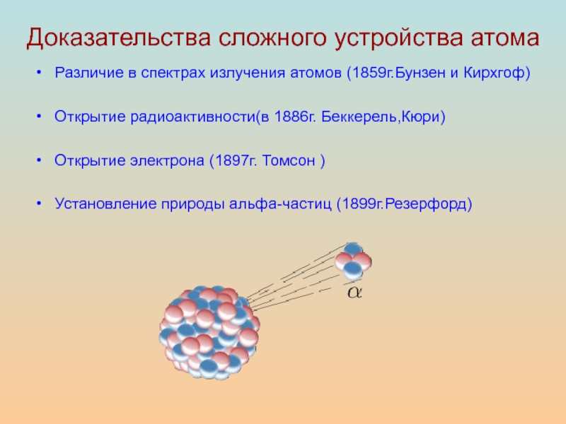 Доказательства сложного устройства атомаРазличие в спектрах излучения атомов (1859г.Бунзен и Кирхгоф)Открытие радиоактивности(в 1886г. Беккерель,Кюри)Открытие электрона (1897г. Томсон